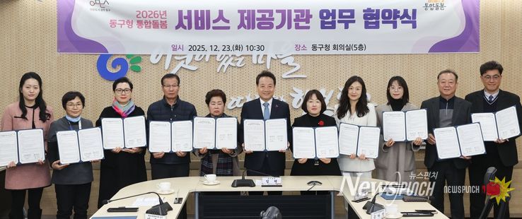 뉴스펀치 김길룡 기자 | 광주 동구는 지난 23일 구청에서 동구지역자활센터 등 11개 서비스 제공기관과 업무협약을 체결하고, 2026년 ‘동구형 통합돌봄’ 사업을 본격 추진한다고 밝혔다.