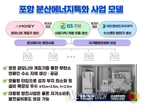 경북 포항 분산에너지 특화지역은 무탄소에너지 공급시스템 실증사업 모델이다. 포항시 흥해읍 일원의 영일만 산업단지(4,440천㎡)를 중심으로 그린 암모니아 기반의 수소엔진발전 실증을 통해 무탄소 분산전원을 상용화하여 청정전력을 지역 수요기업에 직접 공급한다는 계획이다. 분산사업자는 ㈜GS건설과 ㈜아모지, ㈜HD현대인프라코어가 컨소시엄을 구성하여 추진된다.