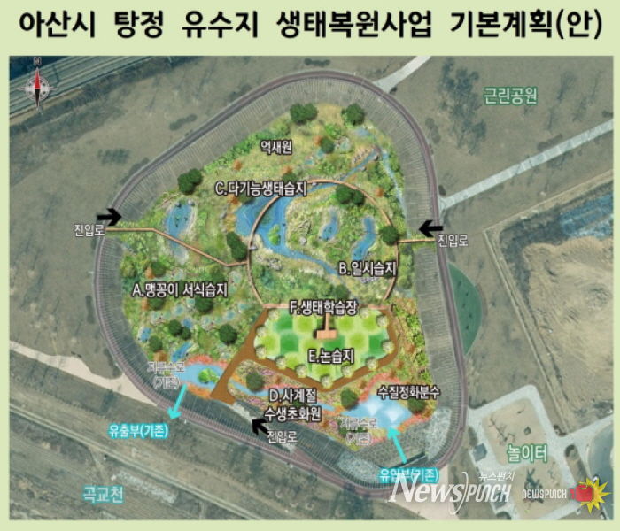 사업 대상지는 탕정지구 도시개발로 조성된 유수지다. 약 1만 4,492㎡의 전체 면적 중 8,700㎡가 생태복원 구역으로 편입된다.