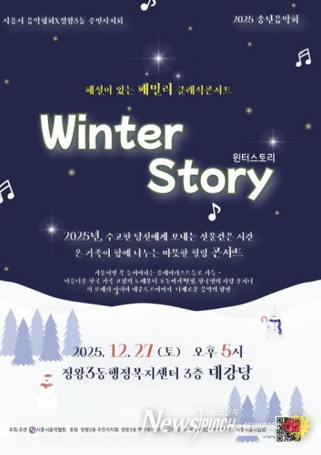 뉴스펀치 김길룡 기자 | 시흥시음악협회는 정왕3동 주민자치회와 협력해 오는 12월 27일 오후 5시, 정왕3동 행정복지센터 3층 대강당에서 2025 송년 음악회 ‘해설이 있는 패밀리 클래식 콘서트, 윈터 스토리’를 개최한다.