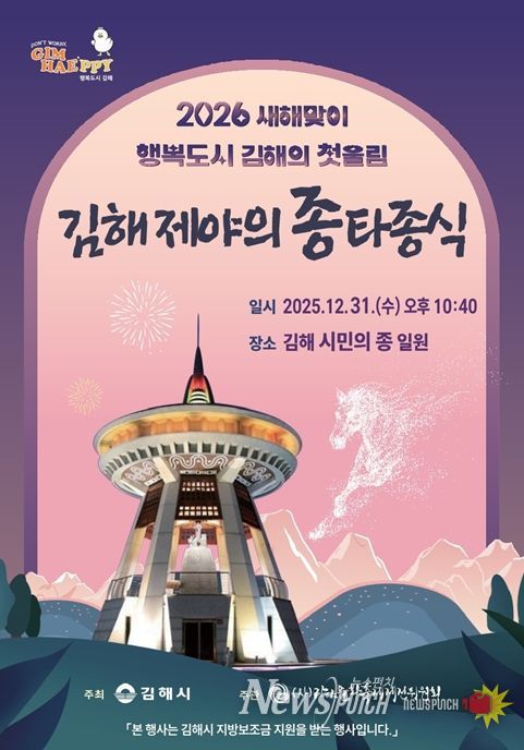 뉴스펀치 김길룡 기자 | 김해시는 ‘2025 김해 제야의 종 타종식’을 오는 31일 오후 10시40분부터 2026년 1월 1일 0시 30분까지 김해시민의 종 일원에서 개최한다고 26일 밝혔다.