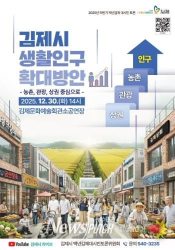 뉴스펀치 정홍균 기자 | 김제시는 오는 30일 오후 2시 김제예술회관 소공연장에서 ‘농촌, 관광, 상권을 중심으로 김제시 생활인구 확대방안’에 대한 백년김제 대시민 토론회를 개최한다고 밝혔다.