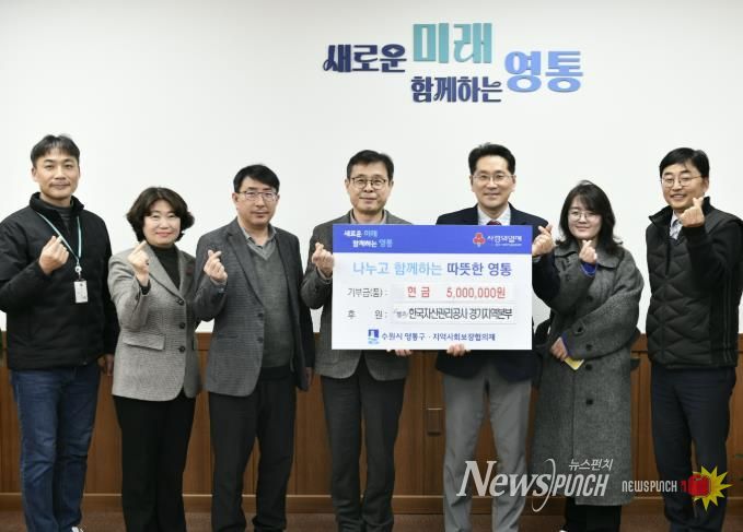 뉴스펀치 김길룡 기자 | 수원시 영통구는 지난 24일 한국자산관리공사 경기지역본부에서 관내 경제적으로 어려움을 겪는 이웃을 위해 성금 500만 원을 기부했다고 밝혔다.