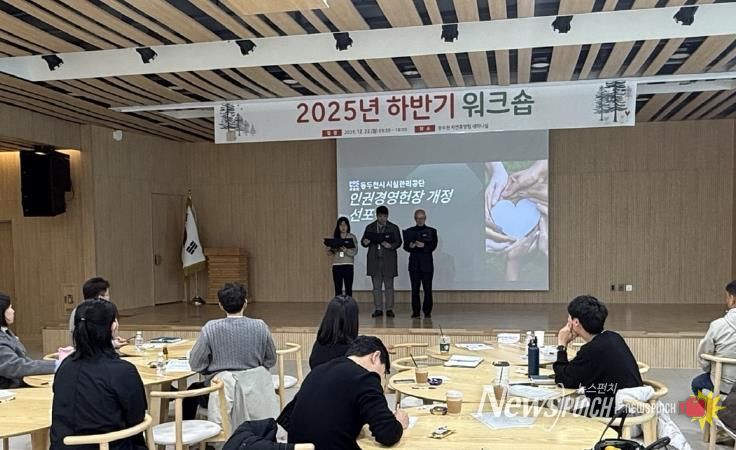뉴스펀치 김길룡 기자 | 동두천시 시설관리공단은 지난 22일 동두천 자연휴양림 세미나실에서 열린 2025년 하반기 워크숍에서 인권경영 헌장 개정 및 선포식을 개최했다고 밝혔다.