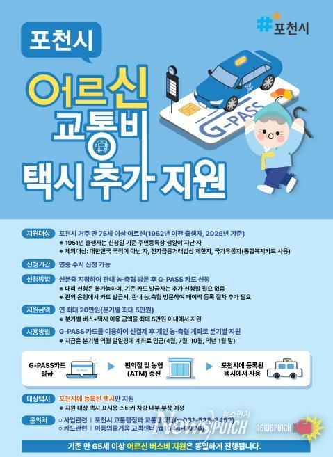 뉴스펀치 김길룡 기자 | 포천시는 2026년부터 포천시에 거주하는 만 75세 이상 어르신을 대상으로 ‘포천시 만 65세 이상 어르신 교통비 지원사업’에 택시 이용을 추가 지원한다.