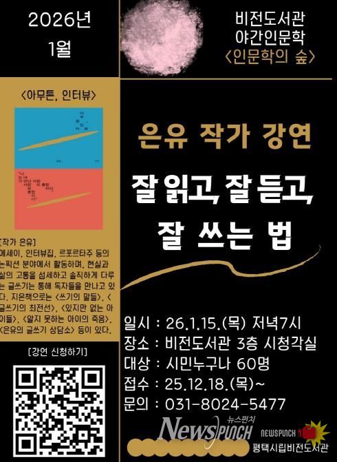 뉴스펀치 김길룡 기자 | 평택시 비전도서관은 다음 달 1월 15일 저녁 7시 은유 작가를 초청하여 ‘잘 읽고, 잘 듣고, 잘 쓰는 법’을 주제로 야간 인문학 강연을 진행한다.