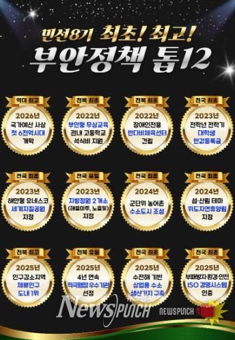 뉴스펀치 정홍균 기자 | 부안군은 민선 8기 출범 이후 추진해 온 주요 정책 성과를 종합적으로 되짚고 앞으로의 군정 방향과 실천 의지를 군민과 공유하기 위해 민선 8기 최초·최고 부안정책 톱12를 선정·발표했다고 밝혔다.