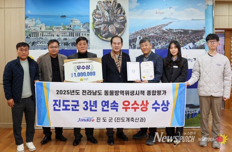 뉴스펀치 김길룡 기자 | 진도군은 전라남도에서 주관한 ‘2025년 동물방역위생시책 종합평가’에서 우수상을 받으며, 3년 연속 우수 지방자치단체로 선정됐다.