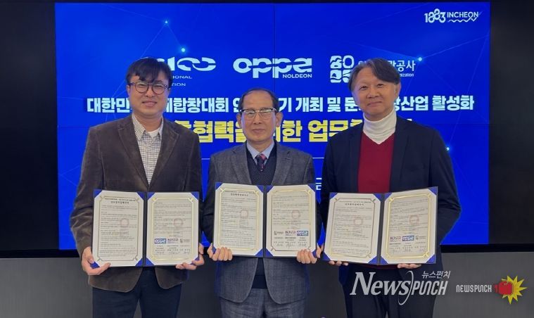 뉴스펀치 김길룡 기자 | 인천관광공사(사장 유지상)와 대한민국국제합창대회 조직위원회(위원장 김희철), ㈜놀던오빠들(대표 김준호)은 26일 인천관광공사에서 ‘대한민국국제합창대회 인천 개최(2026년~2030년) 및 문화관광 활성화’를 위한 업무협약을 체결했다.