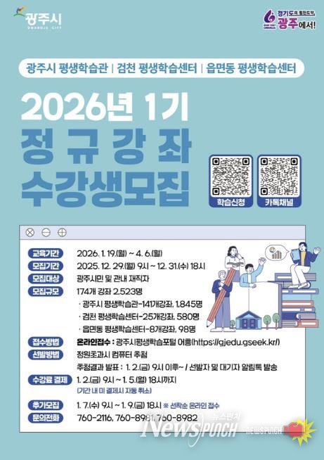 뉴스펀치 김길룡 기자 | 광주시는 12월 29일부터 31일까지 평생학습관, 검천평생학습센터 및 읍면동 평생학습센터에서 운영하는 2026년 제1기 평생학습 프로그램 수강생을 모집한다고 26일 밝혔다.