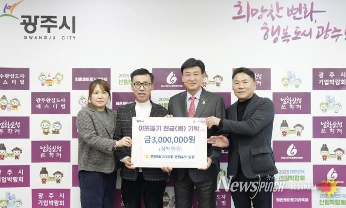 뉴스펀치 김길룡 기자 | 광주시는 지난 24일 탄벌벽산블루밍아파트 입주자대표회의, 동원대학교 최고 경영자 과정 총원우회, 행정타운아이파크어린이집, 심부장 사표쓰고 차린집으로부터 연말 이웃돕기 성금을 기탁받았다.