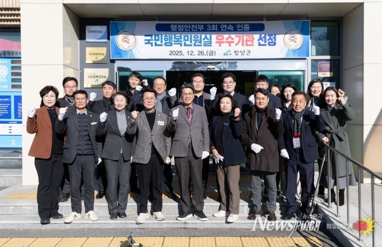 뉴스펀치 김길룡 기자 | 청양군이 26일 행정안전부 주관의 '국민행복민원실' 우수기관 인증을 3회 연속으로 획득한 것을 기념하는 현판 제막식을 개최했다.