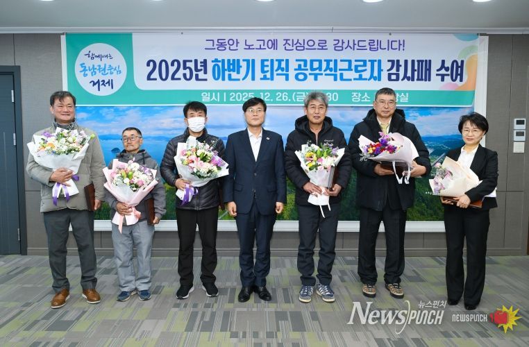 뉴스펀치 김길룡 기자 | 거제시는 26일 시청 시장실에서 2025년 하반기 정년 퇴직을 맞은 공무직 노동자에게 감사패를 수여하며, 인생 제2막의 새로운 출발을 응원했다.