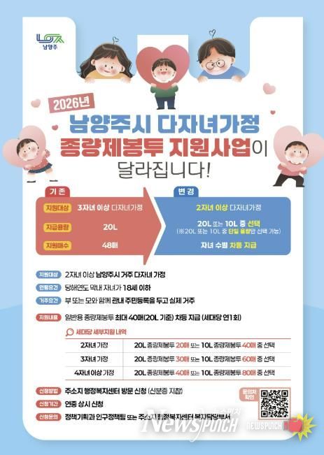 뉴스펀치 김길룡 기자 | 남양주시는 내년 1월부터 ‘다자녀가정 종량제봉투 지원사업’ 대상을 2자녀 이상 가정으로 확대 운영한다고 26일 밝혔다.