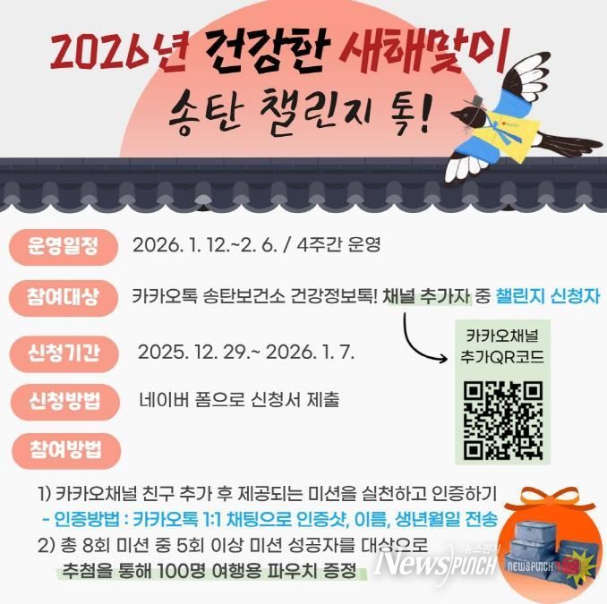뉴스펀치 김길룡 기자 | 평택시 송탄보건소는 12월 29일부터 2026년 1월 7일까지 건강한 새해맞이 ‘송탄 챌린지 톡!’1차 참여자를 모집한다고 밝혔다.