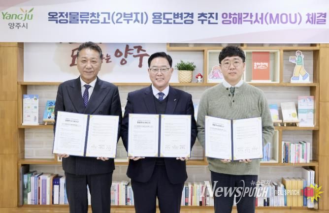 뉴스펀치 김길룡 기자 | 양주시가 26일 시청 시장실에서 옥정물류창고 2부지 사업 취소와 용도변경 추진을 위한 양해각서를 체결했다.