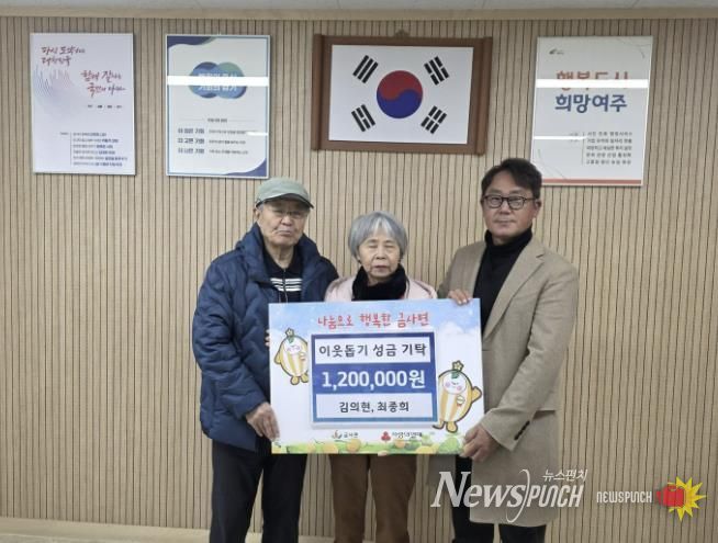 뉴스펀치 김길룡 기자 | 금사면 생활개선회 최종희 회장이 배우자와 함께 지난 24일 여주시 금사면행정복지센터를 방문하여 이웃돕기 성금 120만원을 기탁했다.