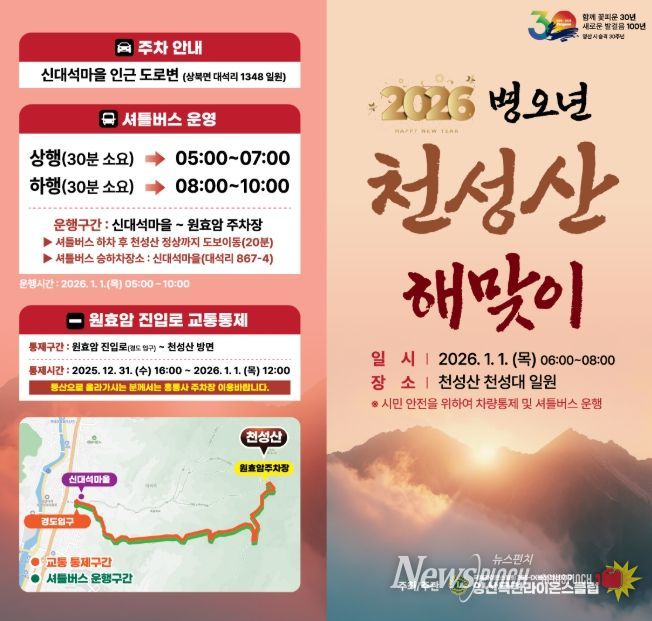 뉴스펀치 김길룡 기자 | 양산시는 올해로 3번째를 맞는 양산 천성산 해맞이 행사가 양산목련라이온스클럽(국제라이온스협회 355-D 양산지구 제3지역 소속)의 주최·주관으로 2026년 1월 1일 천성산 천성대 일원에서 개최된다고 밝혔다.