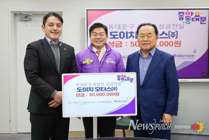 뉴스펀치 김완규 기자 | 서울 동대문구는 도이치모터스로부터 사랑의 성금 5000만원을 전달받았다고 밝혔다. 도이치모터스가 2011년부터 올해까지 15년째 이어온 기부는 2011~2024년 누적 2억6500만원에 달하며, 올해도 5000만원을 보태 지역 나눔을 이어갔다.