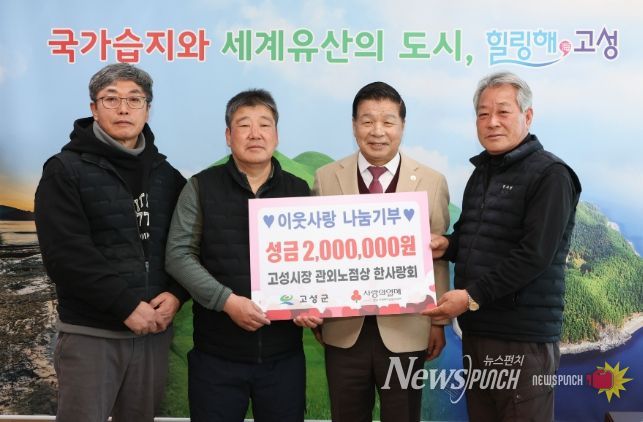 뉴스펀치 김길룡 기자 | 고성군은 12월 26일 고성시장 관외노점상 한사랑회(회장 전후동)에서 연말을 맞아 지역 내 어려운 이웃을 위해 성금 200만 원을 기탁했다고 밝혔다.