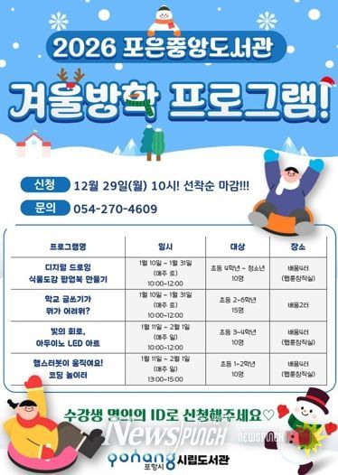 뉴스펀치 김길룡 기자 | 포항시립포은중앙도서관은 내년 1월 10일부터 시작되는 겨울방학 프로그램의 수강생을 29일 오전 10시부터 포항시립도서관 홈페이지에서 사전 접수한다.