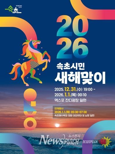 뉴스펀치 김길룡 기자 | 속초시가 병오년 ‘붉은 말의 해’를 맞아 12월 31일(수) 저녁 7시부터 엑스포 잔디광장 일원에서 ‘2026 속초시민 새해맞이 행사’를 개최한다. 다채로운 프로그램이 이어지며 시민의 안녕과 희망찬 새해 출발을 기원하는 화합의 시간이 될 전망이다.