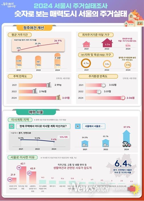뉴스펀치 김완규 기자 | 최근 4년간 서울시민의 평균 거주기간이 6.2년에서 7.3년으로 늘어나 주거 안정성이 높아진 것으로 나타났다. 주택 만족도(3.01점)와 주거환경 만족도(3.06점)도 4점만점 기준 모두 상승해, 서울의 전반적인 정주여건이 개선되고 있는 것으로 분석됐다.