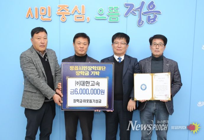 먼저 정읍시의 시내버스 운행을 책임지고 있는 ㈜대한고속(대표이사 이호진)은 이날 장학금 300만원을 쾌척했다.