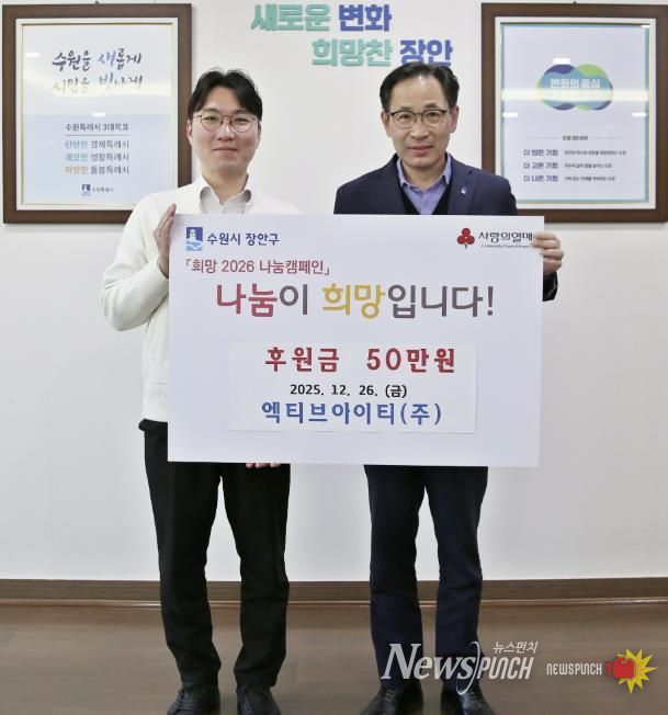 뉴스펀치 김길룡 기자 | 수원시 장안구는 지난 26일 송죽동 소재 엑티브아이티(주)가 기부금 50만 원을 전달했다고 밝혔다. 이번 기부는 장안구 관내 어려운 이웃을 돕기 위한 것으로, 지역사회에 온정을 나누는 뜻깊은 자리다.