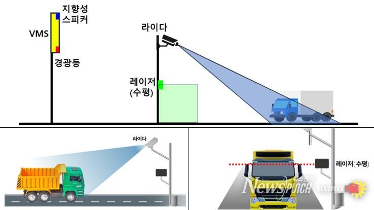 차량의 형상을 인식하는 ‘인공지능(AI) 라이다’와 높이를 정밀하게 확인하는 ‘레이저’를 활용한 이중 감지 방식으로 차량 높이를 자동 판별한다. 높이 제한을 초과한 차량이 감지되면 대형 디지털 안내표지판(VMS), 경광등, 지향성 스피커를 활용한 음성 안내를 통해 운전자에게 지하도로 진입 금지와 우회 경로를 즉시 안내한다.
