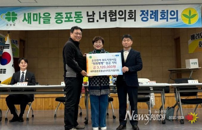 뉴스펀치 김길룡 기자 | 이천시 증포동 새마을남녀협의회는 12월 26일 증포동 저소득 사회초년생을 위한 운전면허 취득(‘뛰뛰빵빵’) 지원을 위해 성금 312만 원을 증포동행정복지센터에 기탁했다.