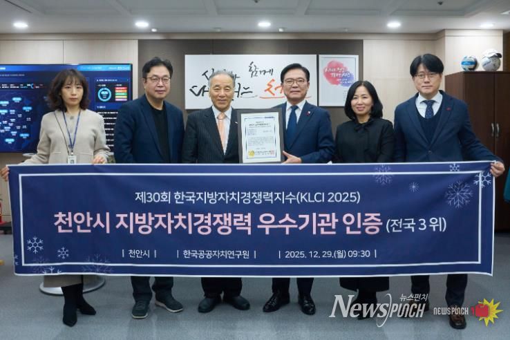 뉴스펀치 김길룡 기자 | 천안시는 올해 한국지방자치경쟁력지수(KLCI) 조사에서 2년 연속 3위를 차지하며 (사)한국공공자치연구원으로부터 인증서를 받았다고 29일 밝혔다.