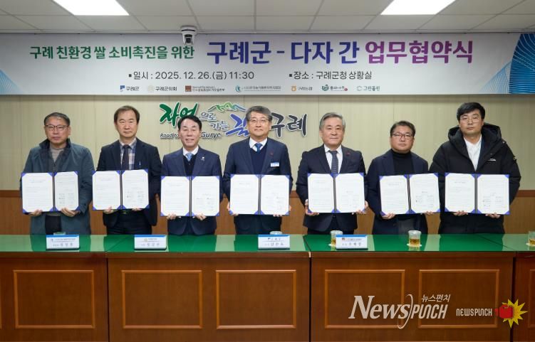 뉴스펀치 김길룡 기자 | 구례군은 친환경 농업의 가치를 확산하고 쌀 소비 기반을 강화하기 위해 공공·금융·농협·민간이 참여하는 다자간 업무협약을 지난 12월 26일 군청 상황실에서 체결했다.