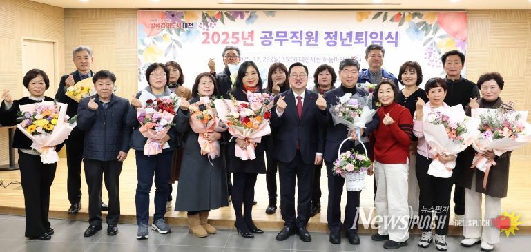 뉴스펀치 김길룡 기자 | 대전시는 29일 시청 하늘마당(20층)에서 정년퇴직 공무직원, 가족, 동료 직원 등 50여 명이 참석한 가운데 ‘2025년 공무직원 정년퇴임식’을 개최했다.