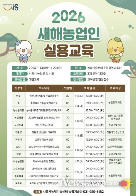 뉴스펀치 김길룡 기자 | 시흥시는 농업인의 전문역량 강화와 안정적인 영농 활동을 지원하기 위해 ‘2026년 새해농업인 실용교육’을 오는 1월 13일부터 23일까지 시흥시농업기술센터 3층 영농교육장에서 운영한다.