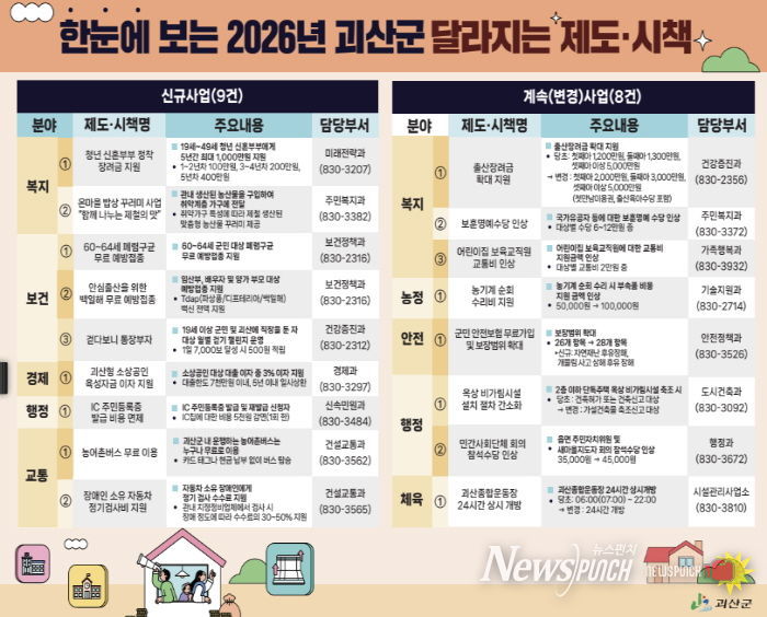 뉴스펀치 김길룡 기자 | 충북 괴산군은 2026년 병오년 새해를 맞아 군민의 일상에서 '바로 체감되는 변화'를 만드는 생활밀착형 정책을 본격 시행한다.