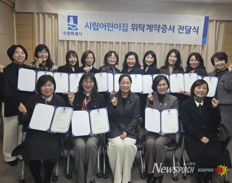 수원시 관계자는 수탁체인 어린이집 원장 15명과 위탁 운영 계약을 체결하고, 시립어린이집 위탁운영 계약 증서를 전달했다.