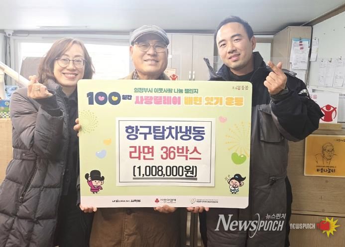 뉴스펀치 김길룡 기자 | 의정부시 장암동주민센터는 12월 29일 항구탑차냉동이 라면 36상자(100만 원 상당)를 기부하며 ‘100일간 사랑릴레이 배턴 잇기’에 동참했다고 밝혔다.