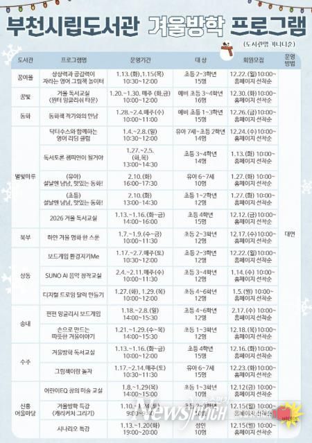 뉴스펀치 김길룡 기자 | 부천시는 겨울방학을 맞아 내년 1월부터 2월까지 부천시립도서관에서 전 연령을 대상으로 독서문화 프로그램과 행사를 운영한다고 30일 밝혔다. 이번 프로그램은 연령과 관심사에 따라 다양한 참여 기회를 제공하기 위해 마련됐다.
