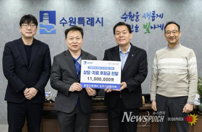 뉴스펀치 김길룡 기자 | 수원시 창업지원센터 입주기업협의회가 “학대 피해아동 지원에 사용해 달라”며 수원시에 후원금 1100만 원을 전달했다. 전달식은 30일 이재준 수원시장 집무실에서 열렸다.