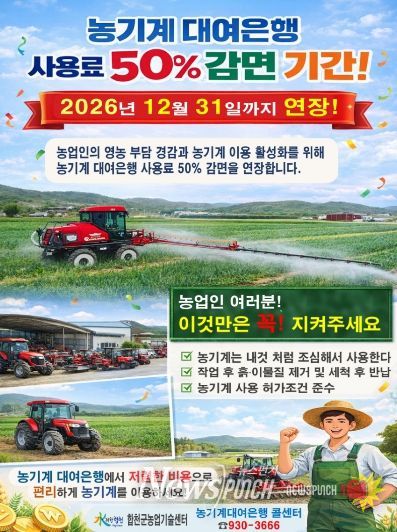뉴스펀치 김길룡 기자 | 합천군은 농업인의 경영 부담을 완화하고 안정적인 영농 활동을 지원하기 위해 농기계대여은행 농기계 사용료 50% 감면 기간을 2026년 12월 31일까지 연장한다고 밝혔다.