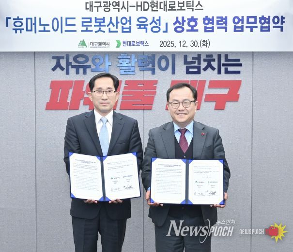 뉴스펀치 조평훈 기자 | 대구광역시는 12월 30일 오후 2시 30분, 산격청사 제1대회의실에서 국내 로봇 시장 점유율 1위 기업인 HD현대로보틱스와 ‘휴머노이드 로봇 산업 육성’을 위한 업무협약(MOU)을 체결했다.