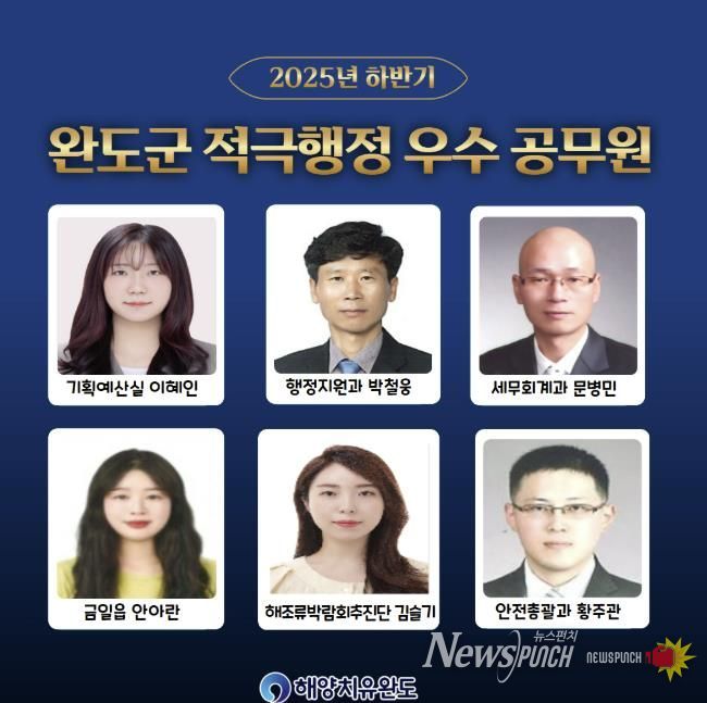 뉴스펀치 김길룡 기자 | 완도군은 지난 24일 적극행정위원회를 개최하고 ‘2025년도 하반기 적극 행정 우수 공무원’ 4명과 협업팀 2팀을 선정했다.