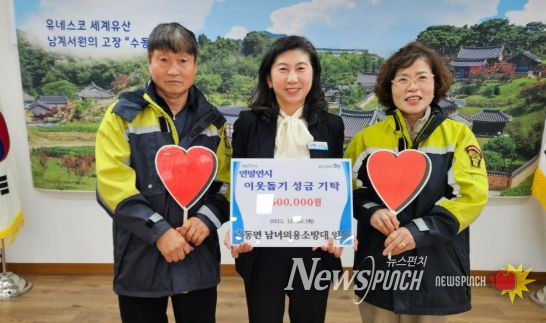 이에 이미연 수동면장은 “지역사회를 위한 봉사활동뿐만 아니라 어려운 이웃을 위해 매년 성금 기탁을 해주시는 따뜻한 마음에 감사드리며, 소중한 성금은 사회복지공동모금회를 통해 도움이 필요한 이웃들에게 전달될 수 있도록 하겠다”라며 감사 인사를 전했다.