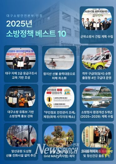 뉴스펀치 조평훈 기자 | 대구소방안전본부는 2025년 한 해 동안 추진한 주요 소방정책 가운데 현장 대응력 강화와 시민 안전 증진에 기여한 ‘2025 대구소방 소방정책 베스트 10’을 선정해 발표했다.