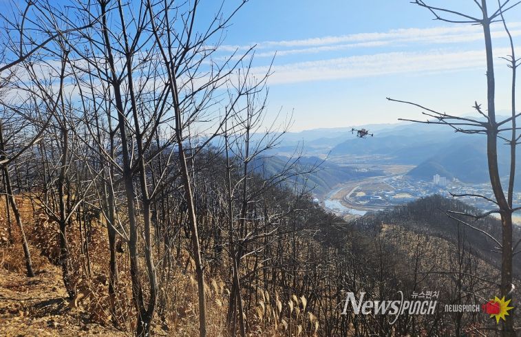 뉴스펀치 김길룡 기자 | 청송군은 지난 30일, 산불피해가 극심했던 청송읍, 파천면, 진보면 군유림 일대에 대체작물 조성 시범사업을 위해 드론을 이용한 더덕, 도라지 종자파종을 시행했다.