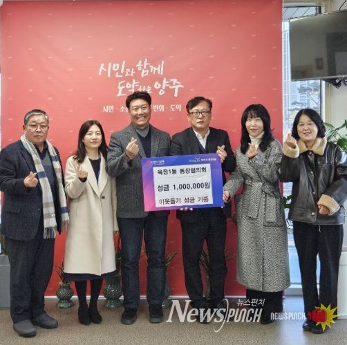 뉴스펀치 김길룡 기자 | 옥정1동 통장협의회가 31일 지역 내 어려운 이웃을 돕기 위해 ‘이웃돕기 성금 100만 원’을 옥정1동에 기부했다. 기부금은 관내 취약계층과 복지 사각지대 가정 지원을 위해 사용될 예정이다.