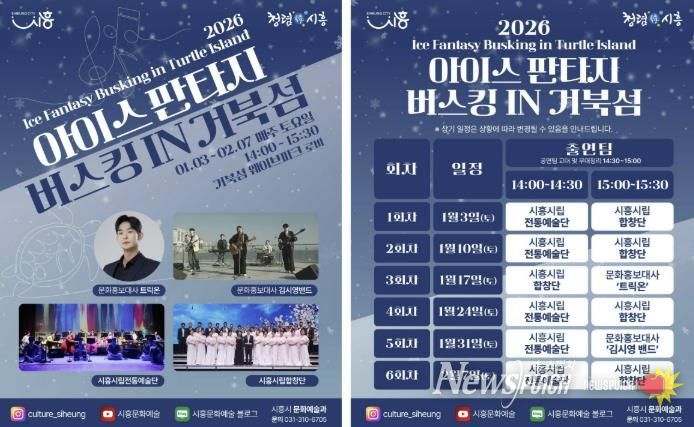 뉴스펀치 김길룡 기자 | 시흥시는 지난 연말에 진행된 ‘2025 시흥 사운드 오브 윈터’의 열기를 잇는 후속 문화예술 프로그램으로, 겨울철 거북섬을 찾는 시민과 관광객에게 풍성한 즐길 거리를 제공하고자 ‘2026 아이스 판타지 버스킹 인 거북섬’을 운영한다.