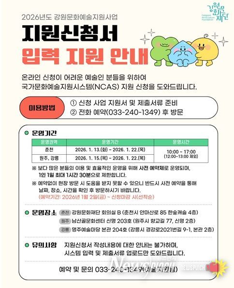뉴스펀치 김길룡 기자 | 강원문화재단이 문화예술지원사업 온라인 신청에 어려움을 겪는 예술인을 대상으로 국가문화예술지원시스템(NCAS) 입력 지원을 운영한다.