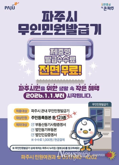 뉴스펀치 김길룡 기자 | 파주시는 시민들의 비용 부담을 줄이고 생활 편의를 높이기 위해 2026년 1월 1일부터 관내 무인민원발급기에서 발급되는 제증명 수수료를 전면 무료화한다고 밝혔다.